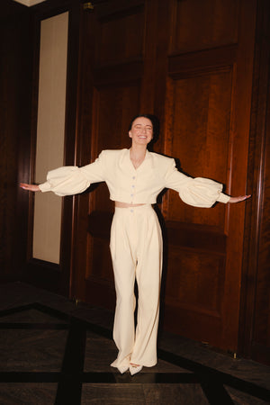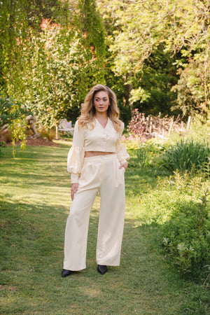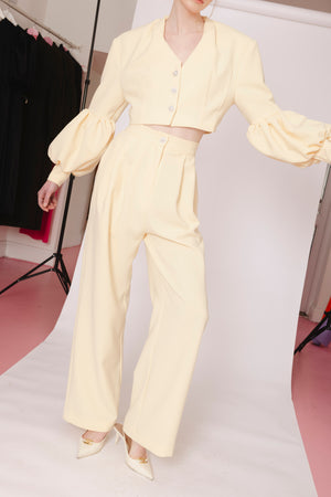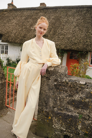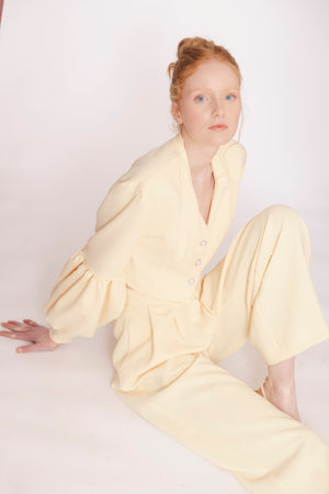 Details:Delicate yellow hue blazer featuring Aoife Mc Namara's signature petal bell sleeves and timeless pearl buttons