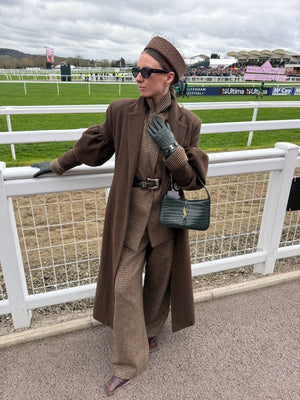Details: Long line peat brown coat featuring Mother of Pearl Button
