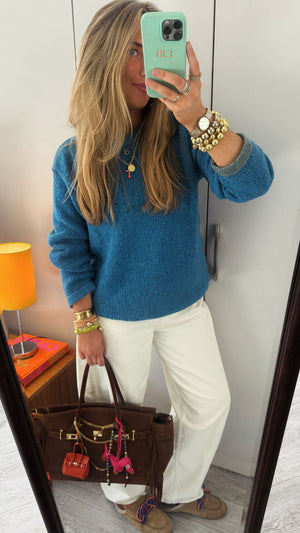 Details: Bright sky blue Irish Woven Wool round neck jumper with baby pink and grey trim on sleeves and waist,