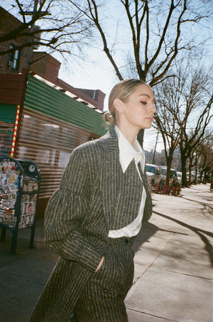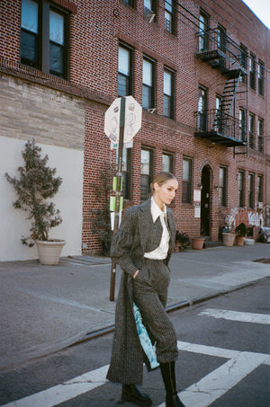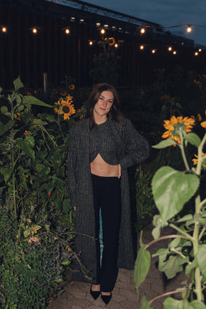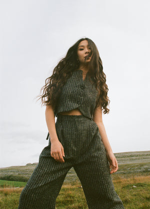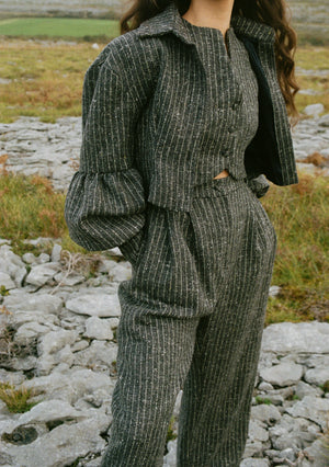 It is possible to awaken and nurture a sense of wonder in the natural world by observing and reconnecting with the source that is nature. Our 'Burren Pinstripe Waistcoat' is made from a grey blend of Irish Tweed inspired by the Burren's Limestone pavement Aoife created her own wool blend local woollen mill John Hanly.