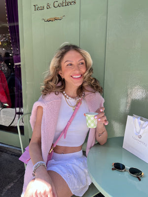 Details:Pink V Neck Irish Woven Wool jumper with lilac and wild meadows teal trim on sleeves,