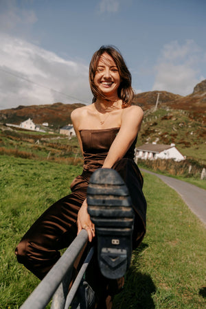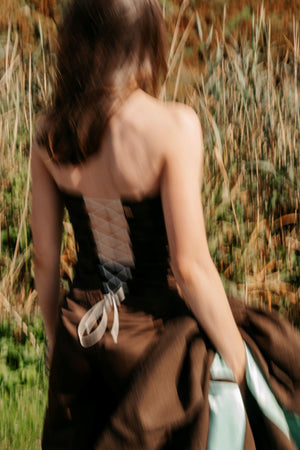 Our Éire corset is reminiscent of Ireland and the beauty of our Island, of the joy and vitality of bright, everlasting green fields, and reminds cherish our rich heritage. Bloom with grace while wearing this special creation. Crafted from Acetate, a responsibly sourced wood pulp which transforms into a fabric with a silky, fluid drape. Lightweight, breathable, and biodegradable, it carries both elegance and ease, moving gently with the body while treading lightly on the earth.
