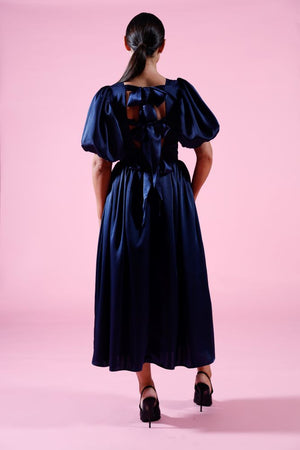 Our Reimagined "A Burren Star Dress" is not only rebellious and empowering but also romantic and feminine. Made from satin with dreamlike puff sleeves, reimagined for the AMN Girl of today with a triple bow band and pockets