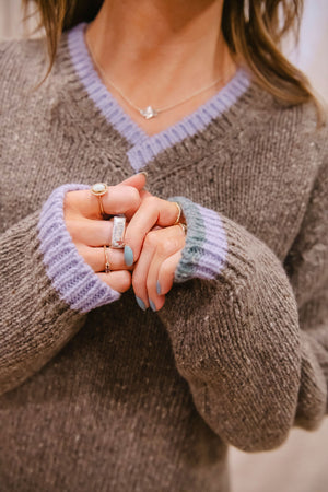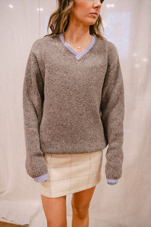 • Details:V-neck mink grey cashmere blend wool jumper with seafoam blue and soft lilac